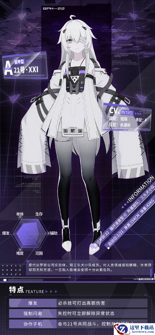 机体名ΧΧΙ,装甲型。外表是娇小的少女,在人类时期由于体质欠佳,大部分生命活动都依赖于随行医疗机的支援。对人类情绪感知模糊,外表阴郁而无知无感,一旦陷入极端会变得十分凶狠危险。武器是随行的支援伙伴呼噜。