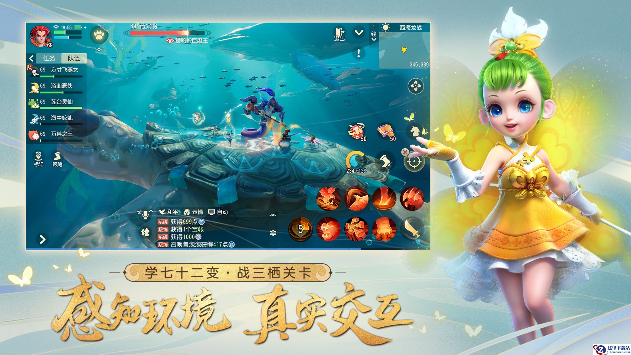 在《梦幻西游三维版》中,少侠还可以在不同的地图中,获得不同的战斗体验。利用大圣的七十二变技能,少侠将上天入地下海,挑战三栖关卡。动态战场里面,少侠需要灵活机变,在应对环境变化的同时抵御敌人的攻击——譬如在海龟背上躲避水弹、在沉船上寻找平衡点。不断变化的战局更加需要少侠们团结一致,合理分工,相信大家将在三界的战场中体验到多种战斗模式的刺激!