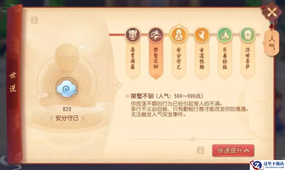 《梦幻西游三维版》的世界不是一成不变的。在其中,不少三界生灵的命运,会由少侠来左右,而根据少侠的选择,少侠的人气值也会因此而改变。若是少侠过于任性妄为,那么难免会招来人气值下降的恶果,不仅走在路上会被路人唾骂,甚至还有可能因为被通缉而捉进牢房!当然,若是少侠能及时迷途知返,善待三界生灵,那么随着人气值的提升,少侠也将获得世间仙魔精怪的认可。