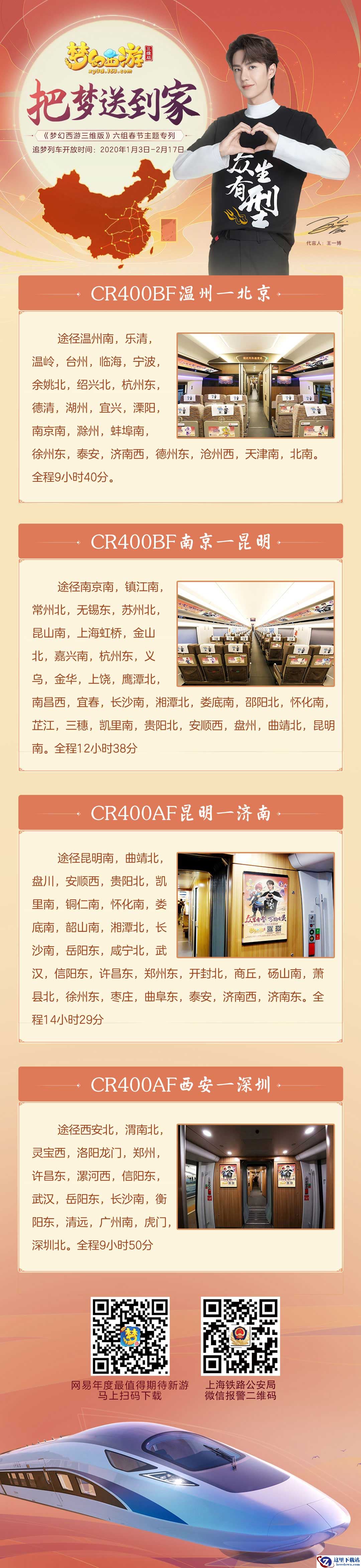 经过少侠们的努力,“为梦一博”应援积分已于1月1日成功累积至5300万,《梦幻西游三维版》将为少侠解锁福利——在春运期间,《梦幻西游三维版》联合代言人王一博,承包联通北上广深的六大高铁线路共333组列车,陪少侠跨越五湖四海,让旅程不再孤单。