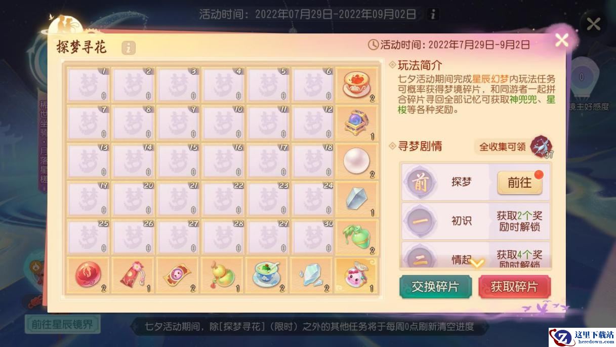 在七夕活动期间,少侠们可通过完成每日任务获得梦境碎片,通过收集、交换、赠与等形式,与同游者协作完成梦境画卷拼图即可获得相应的奖励。七夕特别活动【探梦寻花】为限时开启,活动结束后将关闭入口、回收道具。