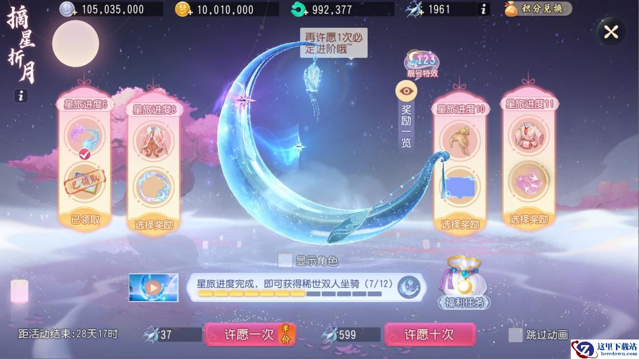 甜蜜七夕,成双而行。梦幻西游三维版首款双人稀世坐骑【月落星槎】将会在【摘星折月】活动中上架,少侠们可通过许愿来推进星旅进度。参与许愿需要的道具【星梭】可通过购买七夕礼包或参与【摘星折月】任务免费获取!每次许愿后都能获得丰富的随机道具和以及1星旅进度。星旅进度为6、8、10、11时,可任选一件星旅进度奖励。
