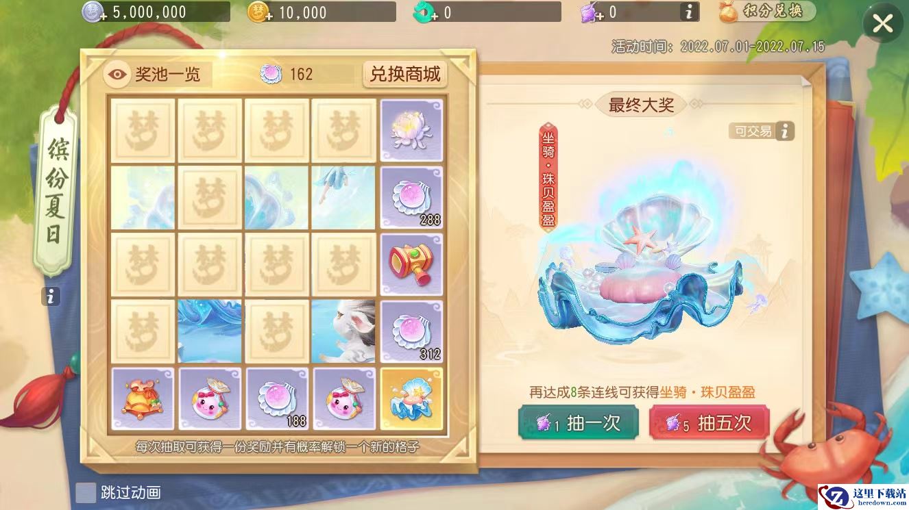 【夏日缤纷】第一期即将在7月15日中午12点结束,届时限定坐骑【珠贝盈盈】将下架。