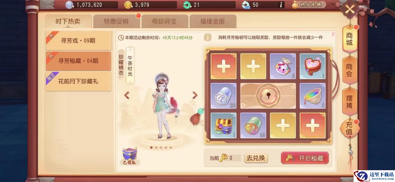 第四期【寻芳觅藏】也会在2月22日至4月11日在【商城】页面开启,少侠们使用芳秘钥]开启秘藏,即有机会获得包括返场珍耀锦衣【午茶时光】、珍耀锦衣【忘川彼岸】、珍耀挂件【小青团】、珍耀头像框【葡萄美酒】、珍耀头像框【曼殊沙华】、夹缬印花、玉皎织锦、彩果酿等在内的丰富奖励。