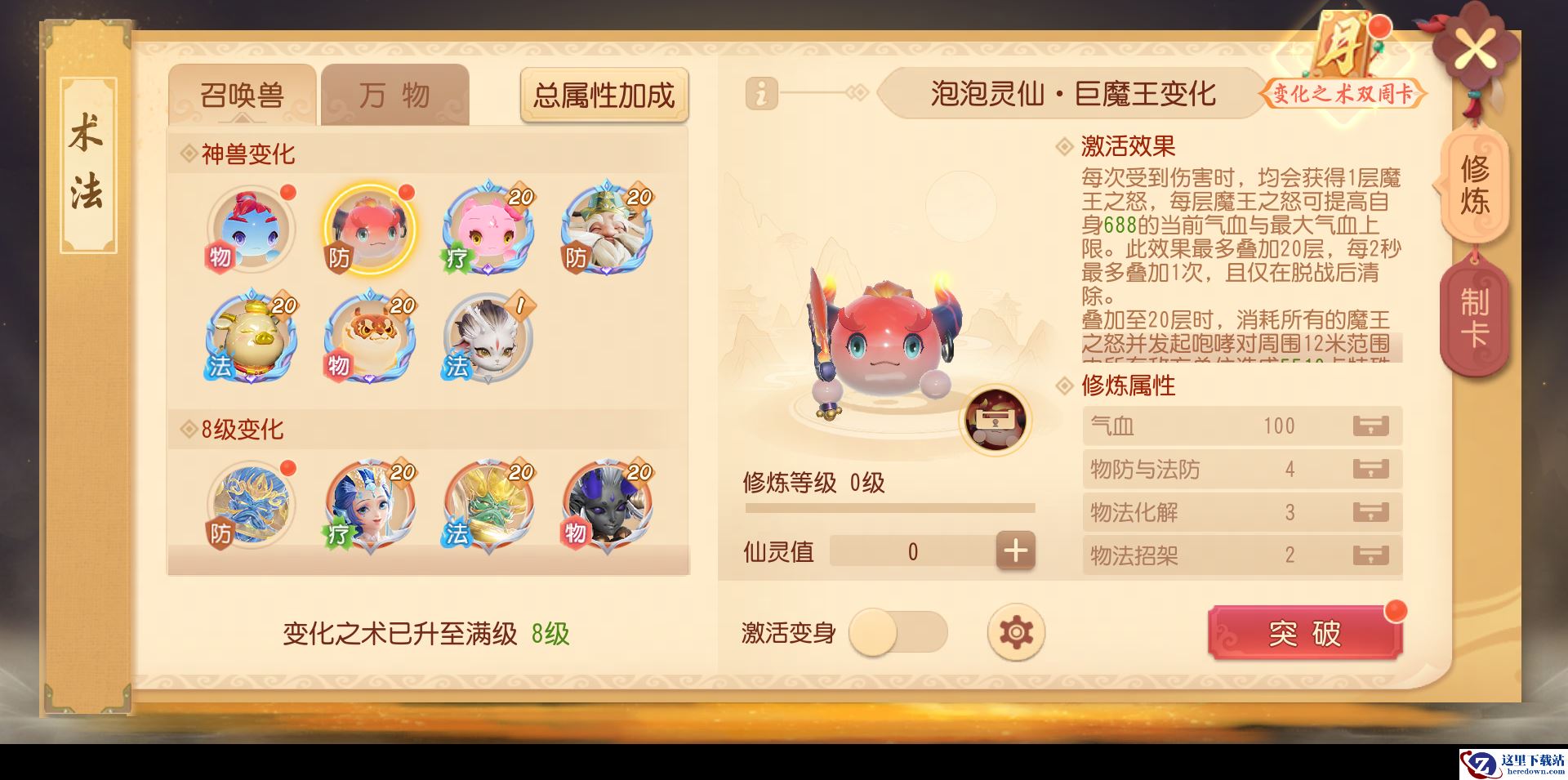 此外,神兽变身卡【泡泡灵仙·巨魔王】现已开放获取!其修炼属性为最大气血、物防与法防、物理化解与法术化解、物理招架与法术招架;激活效果为每次受到伤害时,均会获得1层魔王之怒,每层魔王之怒可提高自身1.5%的当前气血与最大气血上限。此效果最多叠加20层,每2秒最多叠加1次,且仅在脱战后清除。叠加至20层时,消耗所有的魔王之怒并发起咆哮对周围12米范围内所有敌方单位造成(自身气血*0.12)点特殊伤害,并产生大量仇恨值。