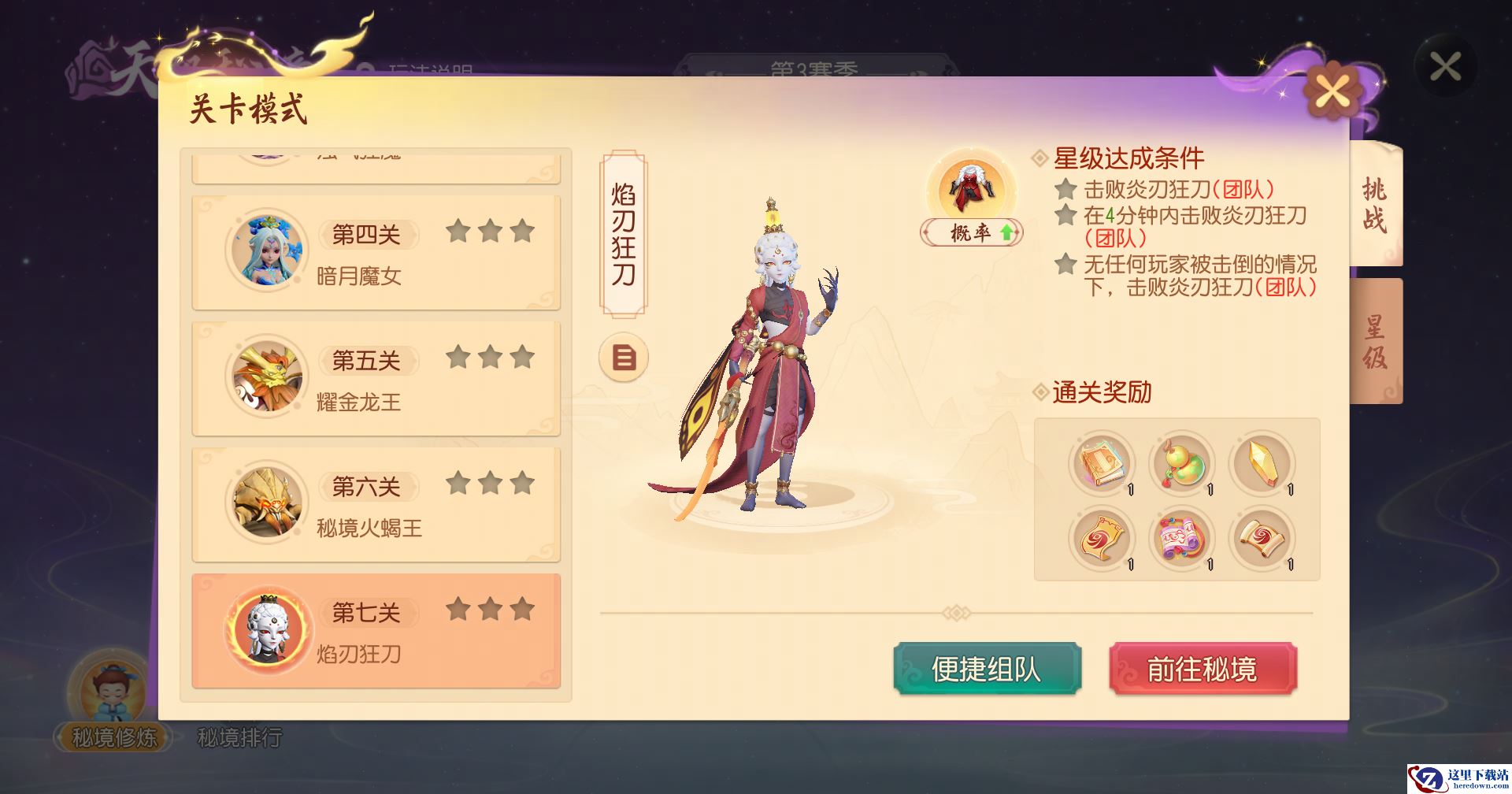 天机秘境第7层首领【焰刃狂刀】已出现在秘境虚空中,等待着少侠前来挑战!【焰刃狂刀】出现的首周将拥有更高的气血与攻击力,少侠挑战成功将额外获得限时紫色称号!少侠击败团队模式下的焰刃狂刀时,有一定概率获取稀有道具【烈焰战衣】。团队中的生涯首通玩家越多,稀有道具掉落几率越高!