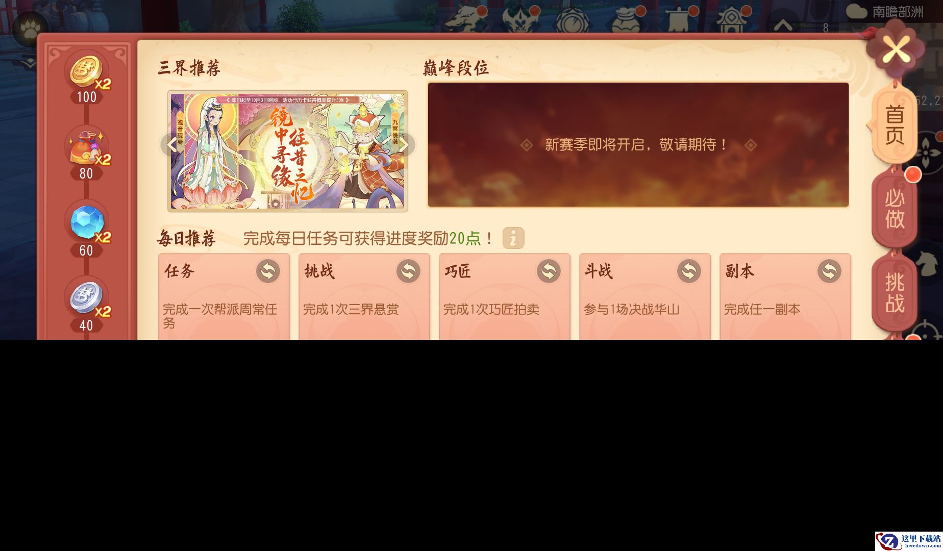 活动系统迎来全面升级,新增“首页”标签,包含三界推荐、每日任务推荐、赛季段位三大模块。原活跃度宝箱改为日进度宝箱,每完成1个每日任务即可领取1个进度宝箱,每档奖励不变。其中,每日任务新增大量任务供少侠选择完成,轻松获取进度宝箱奖励不在话下!此外,玩法依然可获取活跃度,活跃度将只影响活力值获取。赛季段位为全新赛季玩法即将上线,敬请期待!