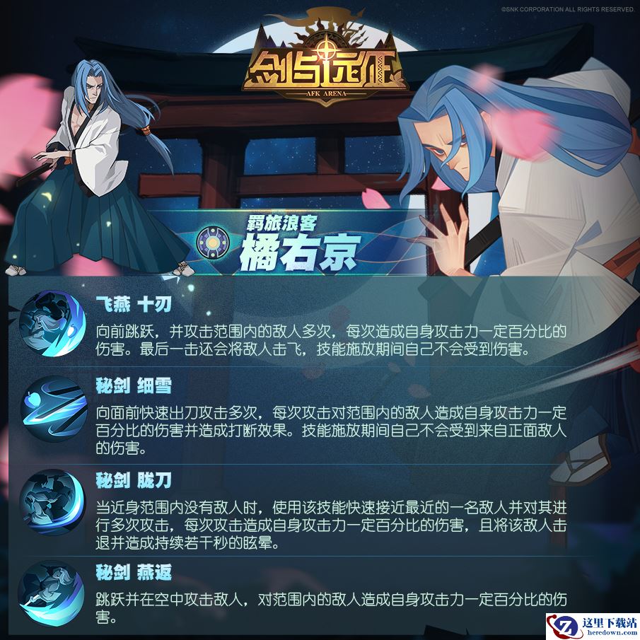 在《剑与远征》中,橘右京的职业定位是能抗能打的战士英雄。作为剑术出神入化的天才剑客,他的技能大多为范围攻击并具有打断效果,和各种阵容都有不错的相性!