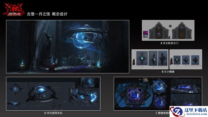 而在古堡内部,画风似乎却陡然一转,将外观上那种“恢弘式的恐惧”之感全部抛尽,转而以“幽暗寂静”来传达战斗即将发生这一信息。在月之馆内,场景以渐染的蓝与黑装点,同时,充满着古朴花纹的棱镜以及神秘复杂的图案更将这一部分场景的幽暗神秘表现了出来。而为了能够制作“浑天仪”这一模型,设计师更是认真研究了“浑天仪”的具体构造,并在查明典籍的情况下再多方询问才放心地制作出了月之馆浑天仪的模型,这一切都是为了能带给玩家非同一般的体验。