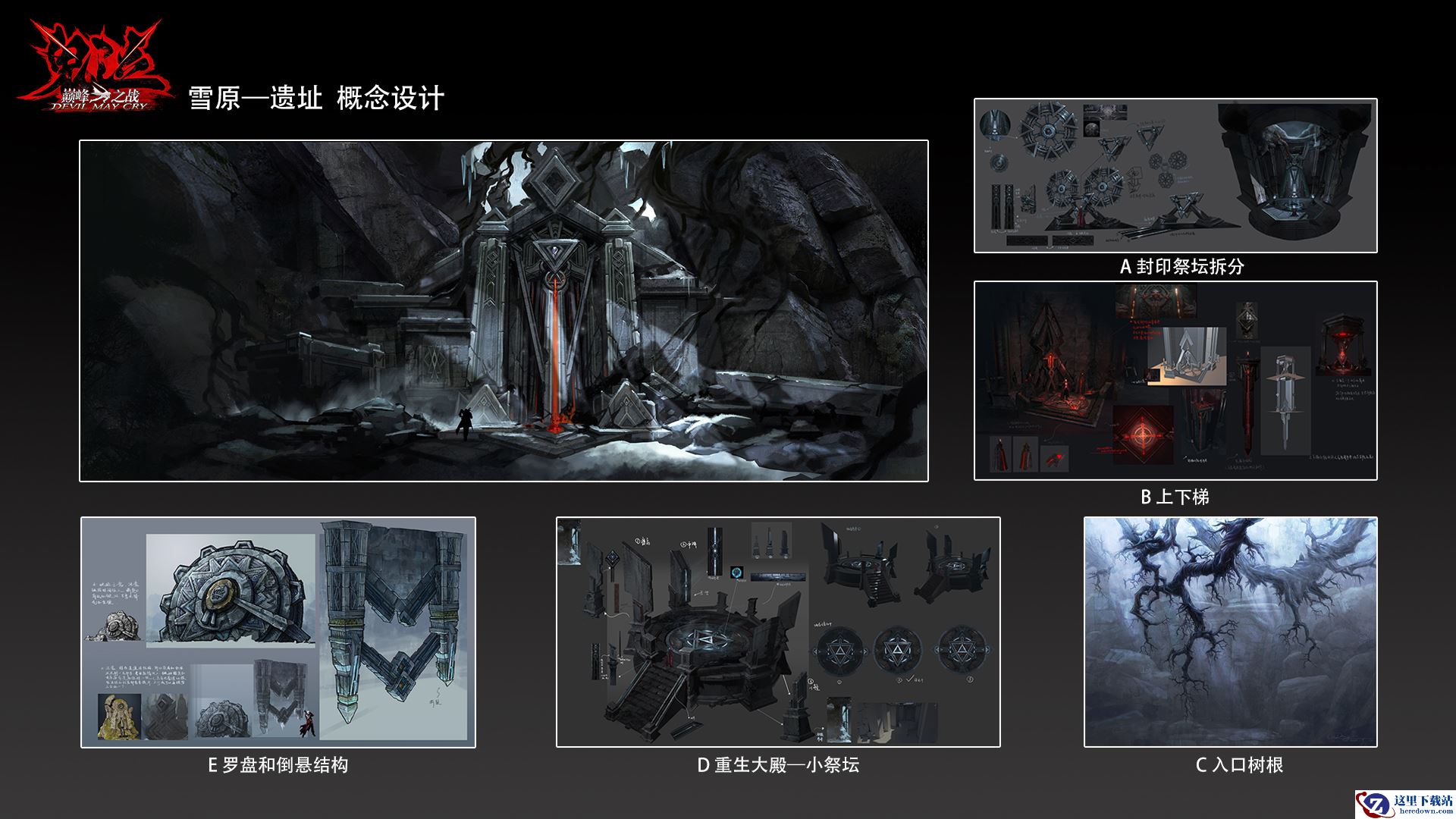 首先来介绍我们的新场景之一,雪原遗址。作为游戏中最应具“破败“意味的建筑,设计师的设定将本场景在时间与空间上的特点极大程度地表达了出来。时间上,在但丁继续深查委托的途中,遭遇了来自更为强大的恶魔的挑战。因此在本场景内,所有的事物都充满神秘这一特点:入口处似乎是故意挡住去路的虬实树根,充满诡异的神殿,被未知人物封印的大小祭坛,都无一不在表现着时间上的沧桑,时刻表达的着“破败”这一建筑主题,也以此衬托出即将登场于主场景之内怪物的恐怖实力。而在整体的空间布局上,各种元素,包括罗盘,倒悬结构等充满哥特风格的细节建筑,都做到了时代与空间相统一,使人、事、物在剧情推进的过程中相当契合。因此,我们可以看到整个《鬼泣-巅峰之战》在建筑美术风格上不仅是以哥特风格点缀,更汲取《鬼泣》原作中的城堡,特米尼格塔以及现实废墟图解等设计元素来强化魔幻主义的风格,如此之下,“古典”与“现代”两种毫不相干的元素碰撞在一起,更加具有韵味。以此让玩家们从时间和空间角度感受到丰富立体的《鬼泣》风味。
