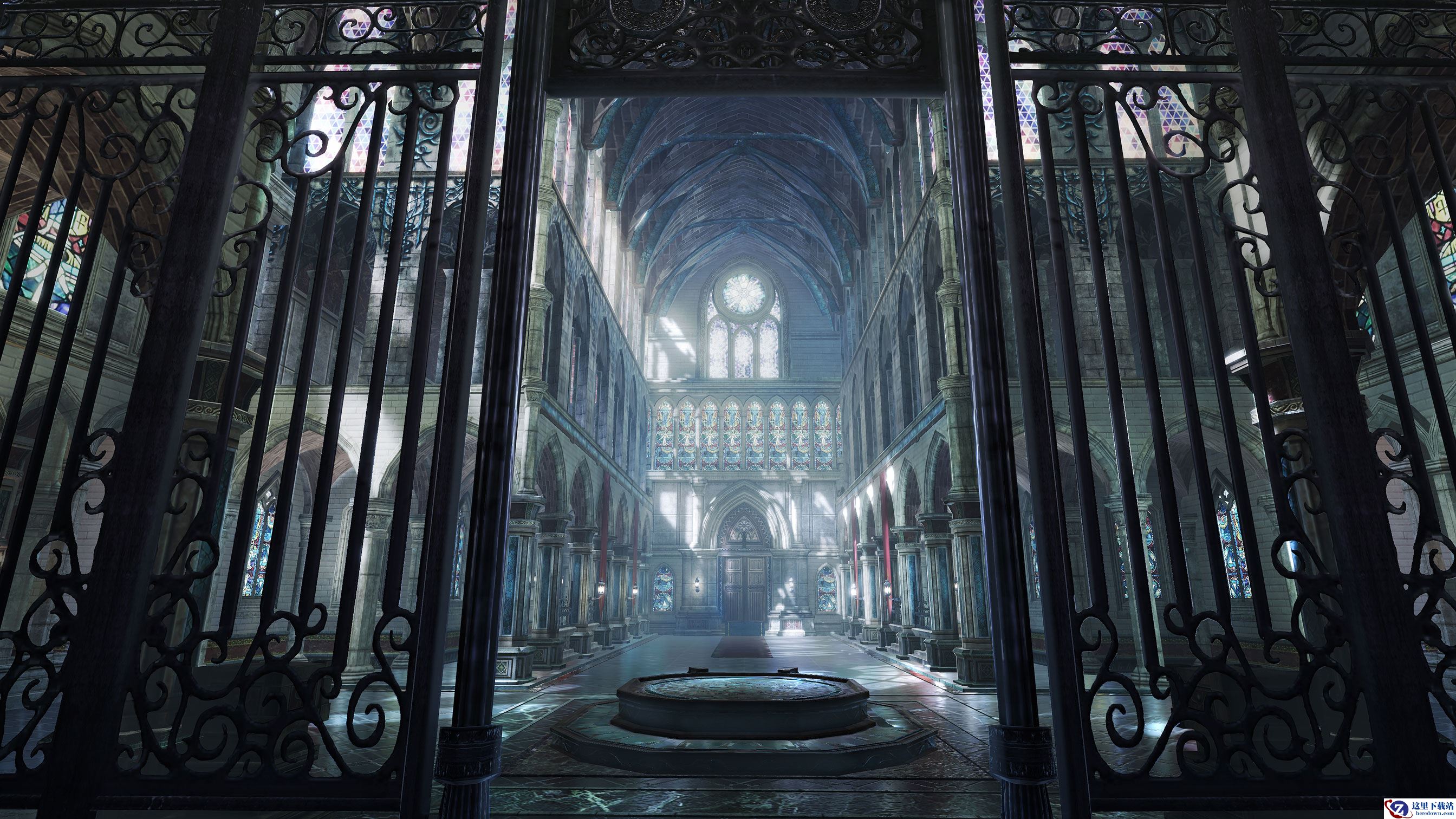 从教堂的建筑概念设计可以看出教堂内部具有庄严的气质,从挑高的门厅和气派的大门到半圆形的拱窗立于二层的回廊之处,每次转角的石砌与琉璃砖瓦的搭配都透露着设计师严谨的考究,教堂的整个设计上偏向于“鬼泣”系列中的魔剑教会设计风格,但连续的拱门和回廊,却又是具有自身的设计特色,比起白色的雅致,黑色的经典这两个永恒不变的主打色,《鬼泣-巅峰之战》选择了交汇的“灰”,玩家们的头顶上是尖形双拱屋顶,琉璃装饰着金色百合花图案,玩家的脚下是蓝灰相间的大理石地面。几步开外有根高大的柱子,大厅纵深一共竖着四根大柱,支撑着双拱屋顶落在横向正中的拱底石,而那里,则是教堂的正中央,接受所有信徒的礼拜之所。
