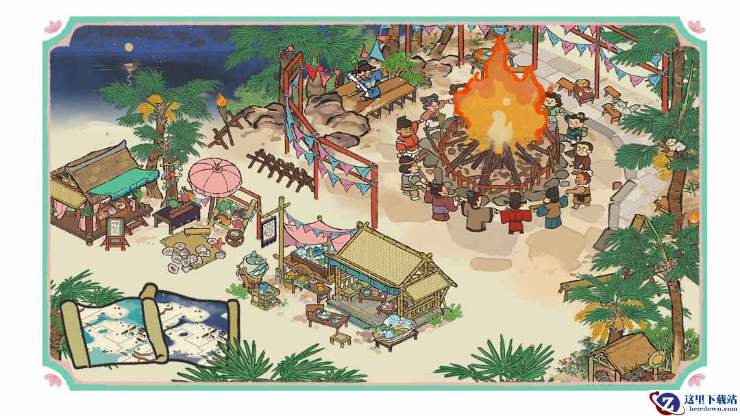 四周年庆典特别海岛小镇「棕影岛」,白昼间清澈碧绿的海浪不断轻拍着沙滩,夜幕下深蓝静谧的海与岛上的篝火交织。知府大人可随心布局限定游园建筑「海风对对店」、「热夏冰冰饮」,还可参与建筑内的庆典游园活动收获丰富奖励。