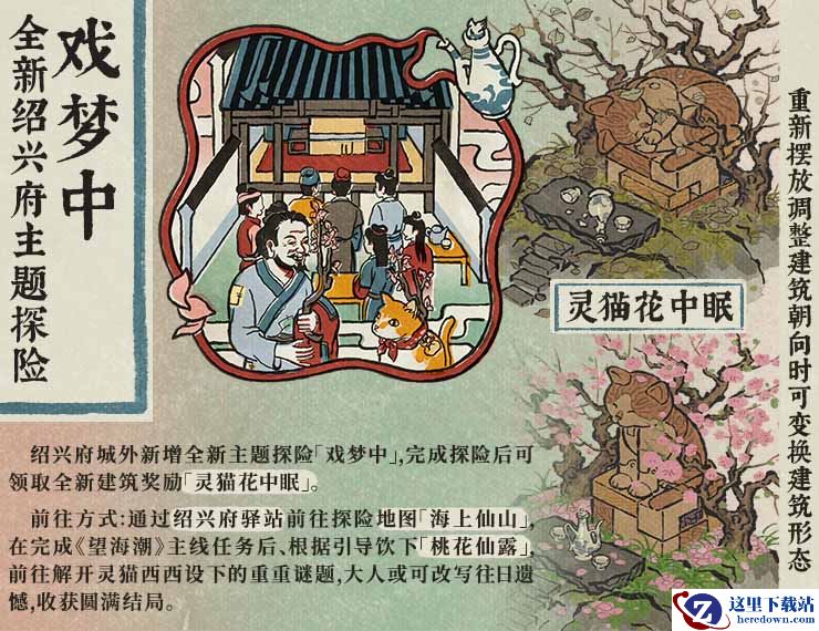 绍兴府城外新增全新主题探险「戏梦中」,完成主线任务后饮下「桃花仙露」,解开灵猫西西设下的重重谜题,大人或可改写往日遗憾,收获圆满结局。