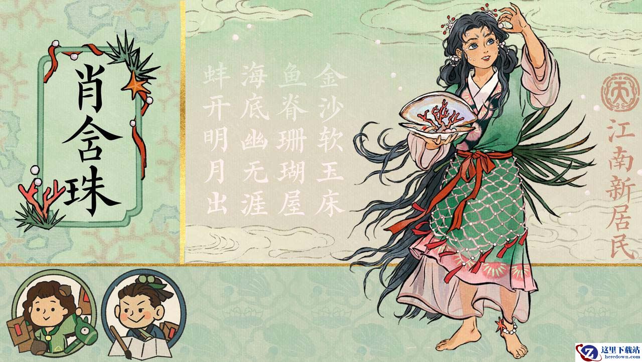 「肖含珠」是一位拥有十四岁女孩外表的蚌精,她心怀远大梦想,希望终有一日能像郑和大人一般站在甲板上迎风而立,指挥浩浩荡荡的船队征服大海。知府大人可通过收集「篝火大会」的火花,在周年庆典期间进行免费兑换,收获这位古灵精怪的江南新居民。