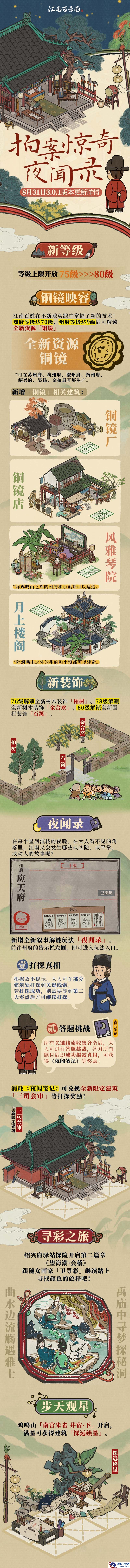 本次新版本中知府大人可以升级至80级,并进行「铜镜」资源线的生产及建造;在新玩法「夜闻录」中体味江南平凡百姓的悲欢喜乐;跟随「徐霞客游记」游历大好山河,领略各地风土人情。另有全新音游活动即将上线,将于9月14日开启,敬请期待!
