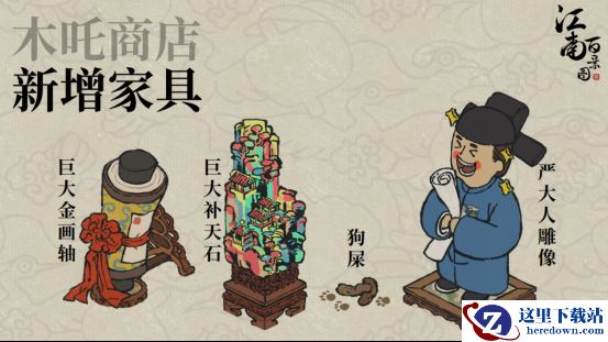 严大人、木吒、惧留孙、袁洪等人精挑细选了很多新的建筑、装饰、家具好物,等待知府大人前往交易。苏州府知府宅邸也新增了许多限定家具,包括自定义拼接的「青砖水桥」「水上浅草」和「金蟾雕像」。