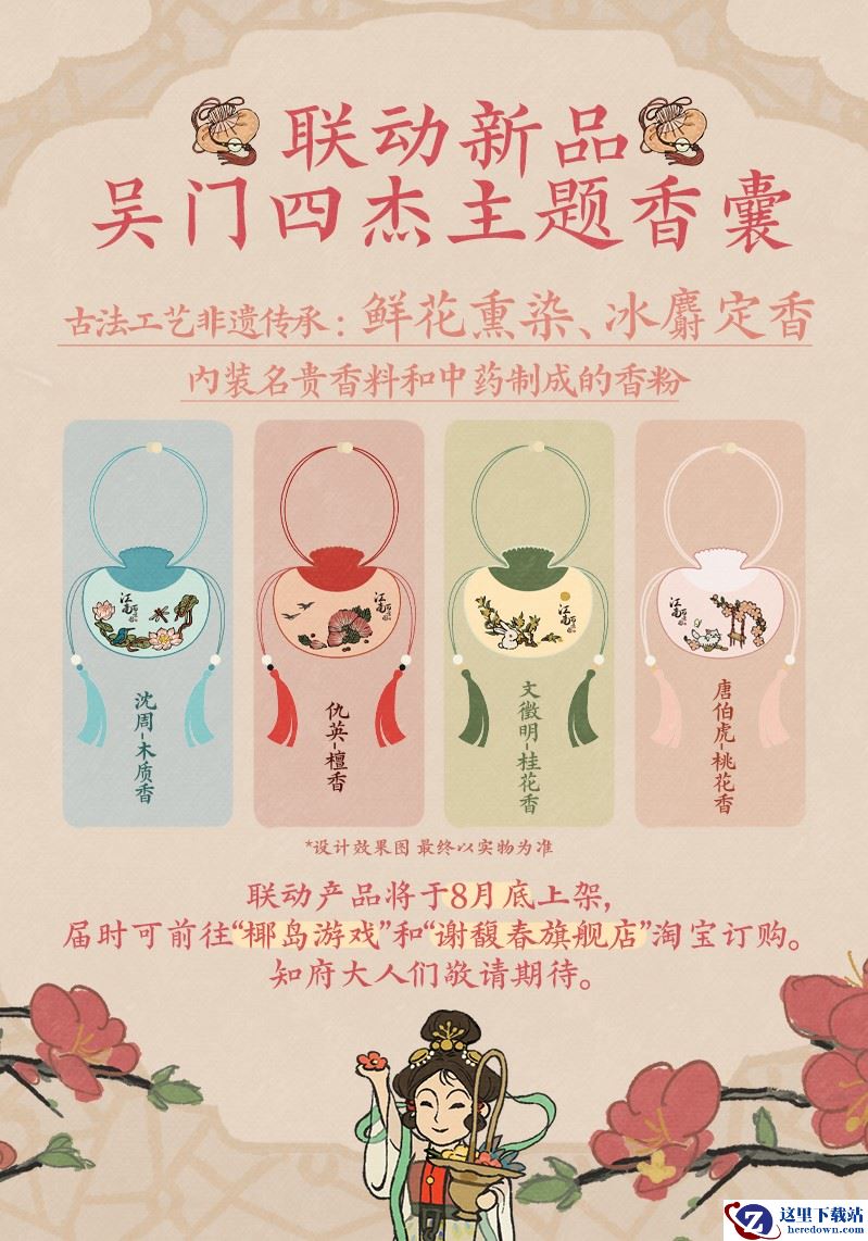 与此同时,双方也将共同推出联动商品【吴门四杰主题香囊】。以明朝著名的吴门四杰为灵感,传承鲜花熏染,冰麝定香技艺,打造传统而又年轻化的香囊产品。香囊中内装以名贵香料和中药材制作的香粉,展现传统匠人工造。联动产品将于8月底上架,届时可前往淘宝店铺“椰岛游戏”和“谢馥春旗舰店”,了解更多产品信息。