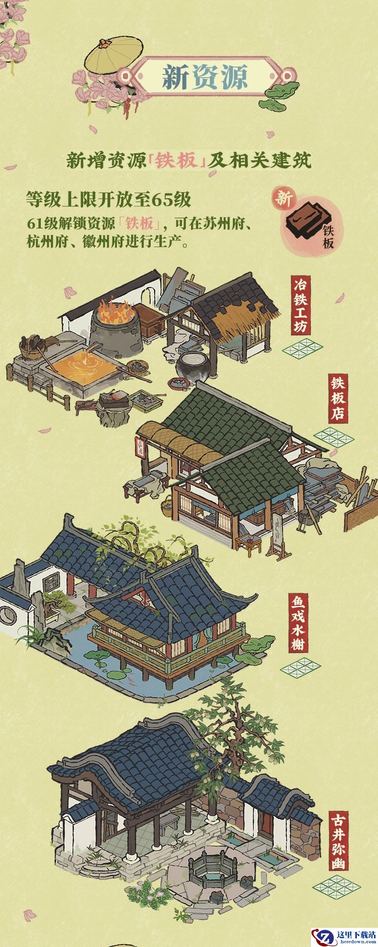 1.7.1版本中,游戏等级将开放至65级,并于61级解锁全新资源【铁板】,刻在苏州府、杭州府、徽州府进行生产。可解锁【冶铁工坊】【铁板店】【鱼戏水榭】【古井弥幽】几款全新建筑。