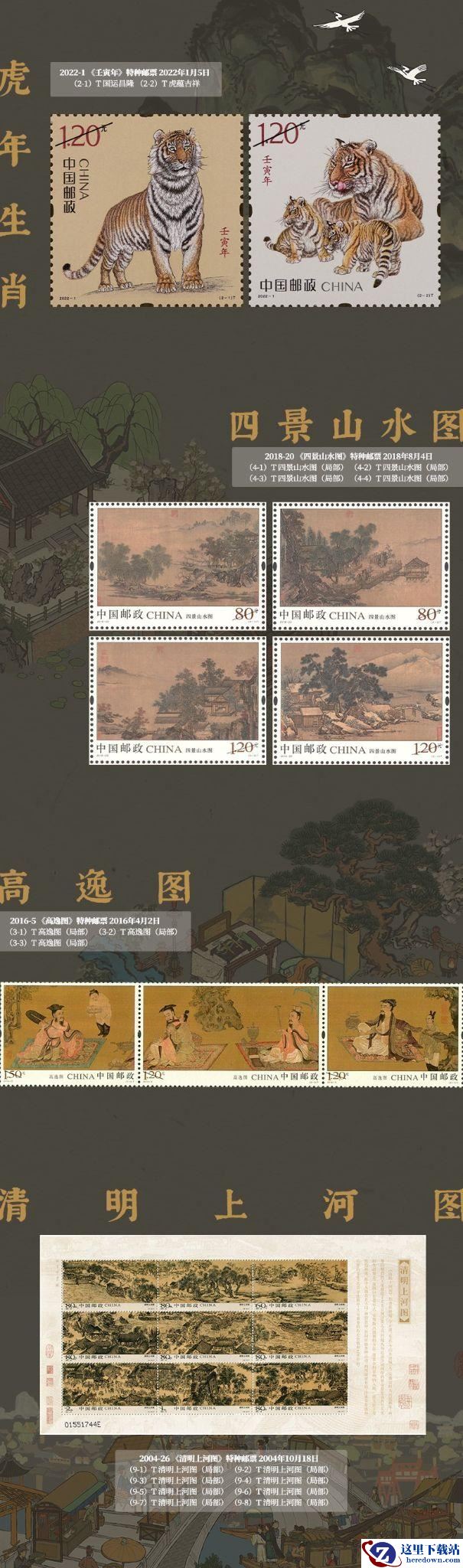 本次联动邮册《画檐》中首选了《四景山水图》、《高逸图》、《清明上河图》等古画主题的特种邮票,充分展示了中国艺术史上有关山水、历史人文和古城风貌的艺术成就,指尖抚过千古芳华之余,感受这份浓缩在邮册内的中华艺术魅力。