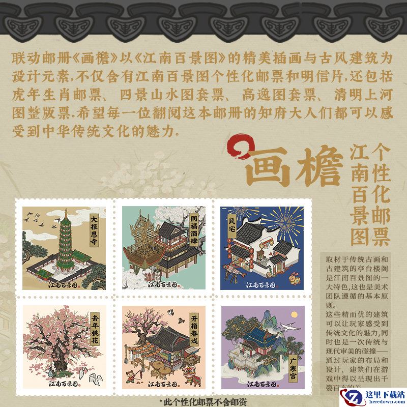 此外邮册内还配置了整版6枚的个性化邮票,选图是以《江南百景图》游戏中的“民宅”、“大报恩寺”、“同福酒肆”、“开箱春戏”、“去年桃花”和“广寒宫”为表现内容,将游戏特色与传统古画进行了一次跨次元的巧妙结合,打开邮册即可寄情于山水之间,尽览江南风华。