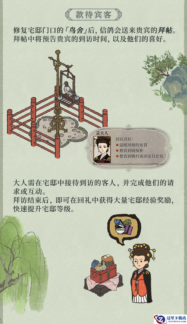 此外,在修复宅邸的鸟舍之后,信鸽会带来贵宾的拜帖。玩家根据他们的需求更换家居装潢,若能赢得贵宾们的欣赏,便可从他们那里获得丰厚奖励。