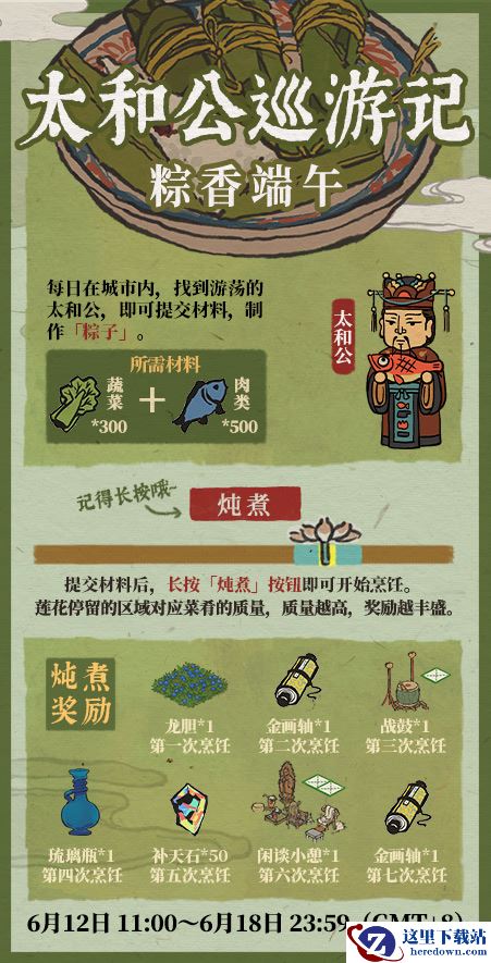 在城中找到太和公,提交食材,烹饪粽子即可领取补天石、金画轴、闲谈小憩等奖励;