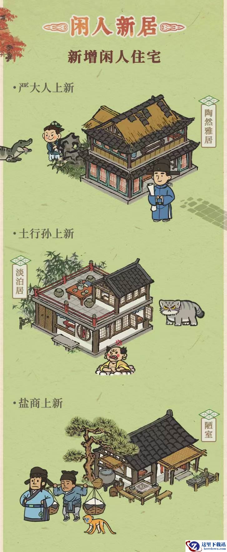玩家可以通过游戏中漆器资源、严大人、盐商、土行孙等玩法免费解锁,用它们来点缀你的江南小镇吧!