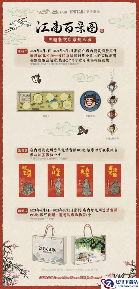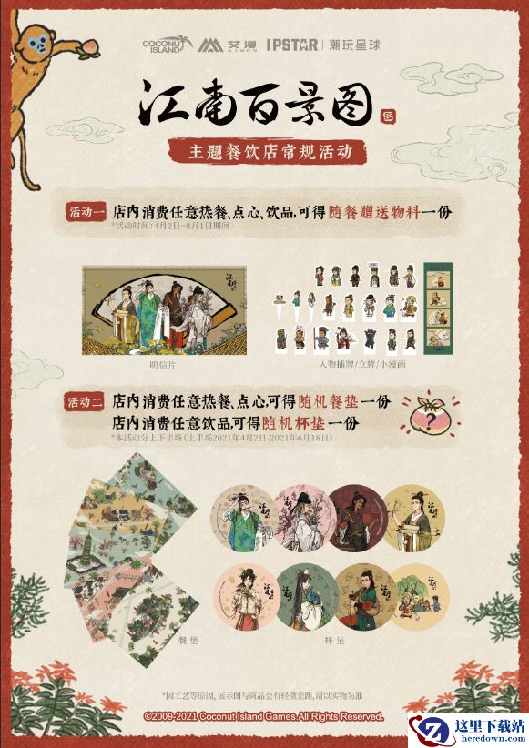 除此之外,常驻活动则有消费任意餐饮赠送随机物料,其中购买热餐及饮品还将获得随机餐垫、杯垫一份!更有严大人徽章、吴门四杰亚克力挂件、主题餐饮店购物袋等你来拿!茶余饭后,满载而归。