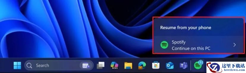 本次更新引入了全新的“安卓应用接力”功能。用户在安卓手机上运行应用(如 Spotify)时,电脑任务栏会弹出“续用提醒”,可直接在电脑端打开并继续原先的内容。