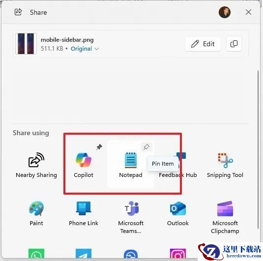 Windows 分享界面则支持将常用应用固定在“使用以下方式分享”区域。