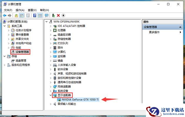 2、计算机管理窗口中,点击左侧的【设备管理器】,然后在右侧找到并展开【显示适配器】,双击打开【显卡驱动】;
