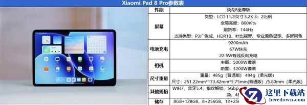 最核心的芯片:本次的Pro版搭载了骁龙8至尊版,采用第二代3nm制程工艺打造,高通Oryon的CPU架构。安兔兔跑分可达300W分。是当前安卓平台最顶级的芯片之一。标准版同样迎来大幅升级,处理器升级为第四代骁龙8s,其性能甚至超过了上代小米平板7 Pro的芯片。全系可选的柔光屏:柔光屏通过纳米蚀刻技术做到了降低99%的炫光,保证复杂灯光条件下屏幕的可读性。本次的小米平板8 系列的柔光屏还有更进一步的强化,采用了全新的小米自研AG蚀刻技术,相较于普通柔光屏的闪点降低了44%,不易出现画面杂色和颗粒感,画面更加细腻,视觉观感更柔和。更加轻薄的机身:机身厚度仅5.75mm,重量仅485g。轻松单手握持。在轻薄的同时质量不减配,全系标配的9200mAh电池和WIFI7,兼顾了便携实用。全新的Xiaomi HyperOS 3:众多界面元素全面换新,更是针对平板的大屏做了针对性优化,不仅有全面对标PC的桌面级浏览器。还有上下分屏的多任务操作,9:1的横向多任务。还有全新的小米焦点触控笔Pro,一体化的笔身无按键设计,支持16384级压感,快捷环,激光笔等多种实用功能。