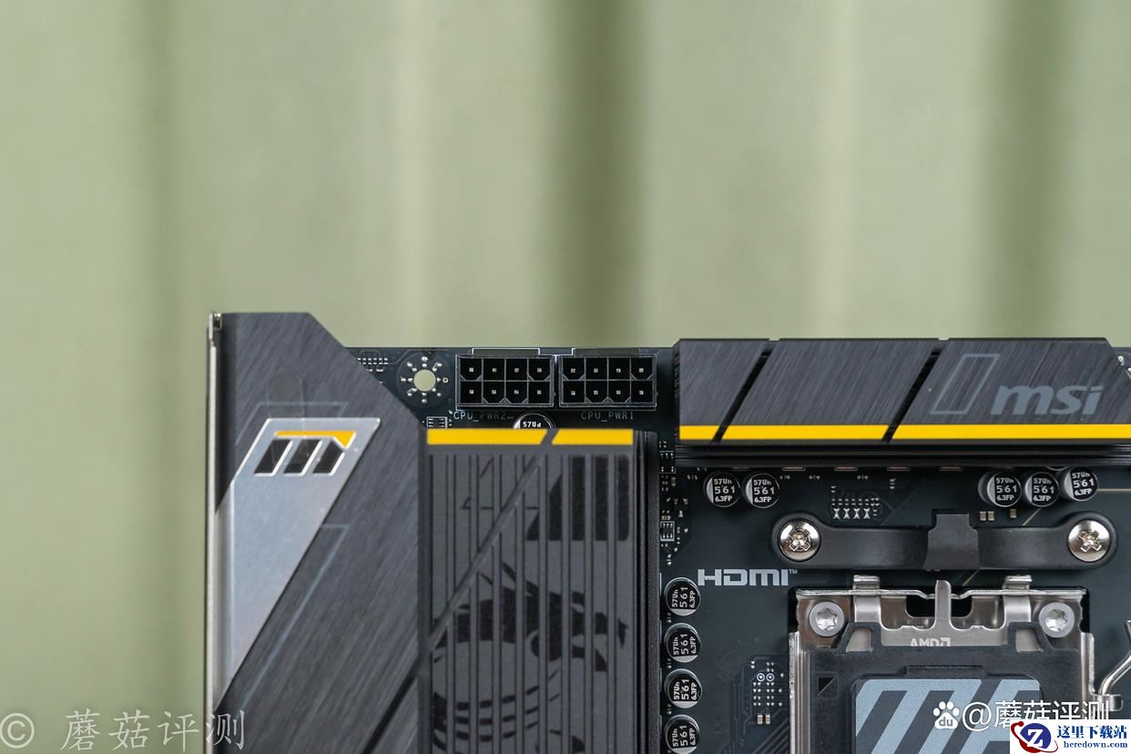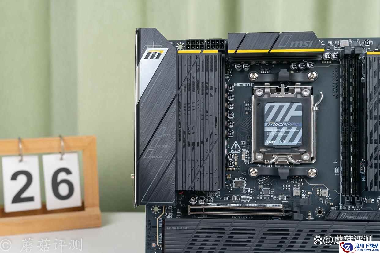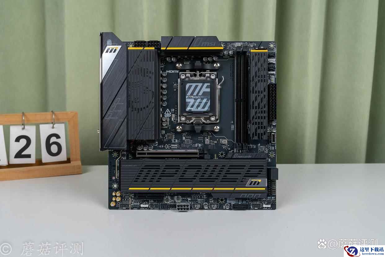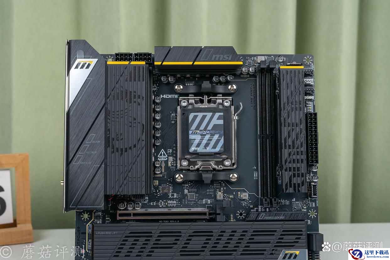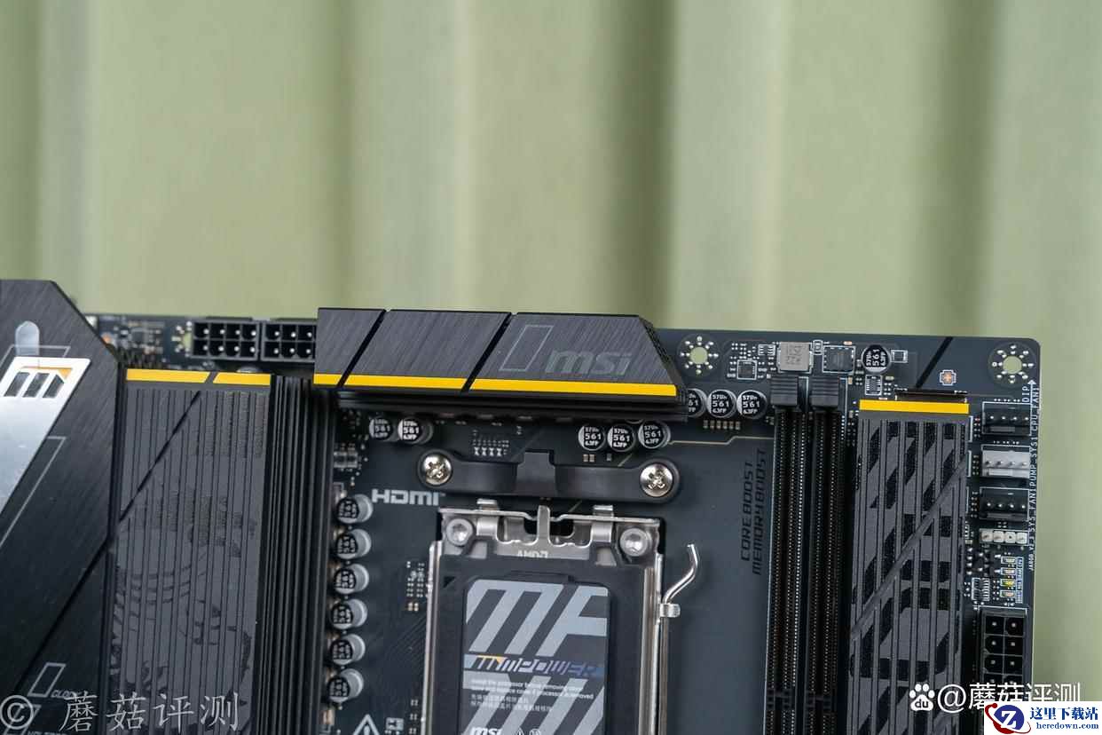 ▼主板的正面外观非常漂亮,有大量的金属件覆盖,且金属件表面的涂装、设计很精致。