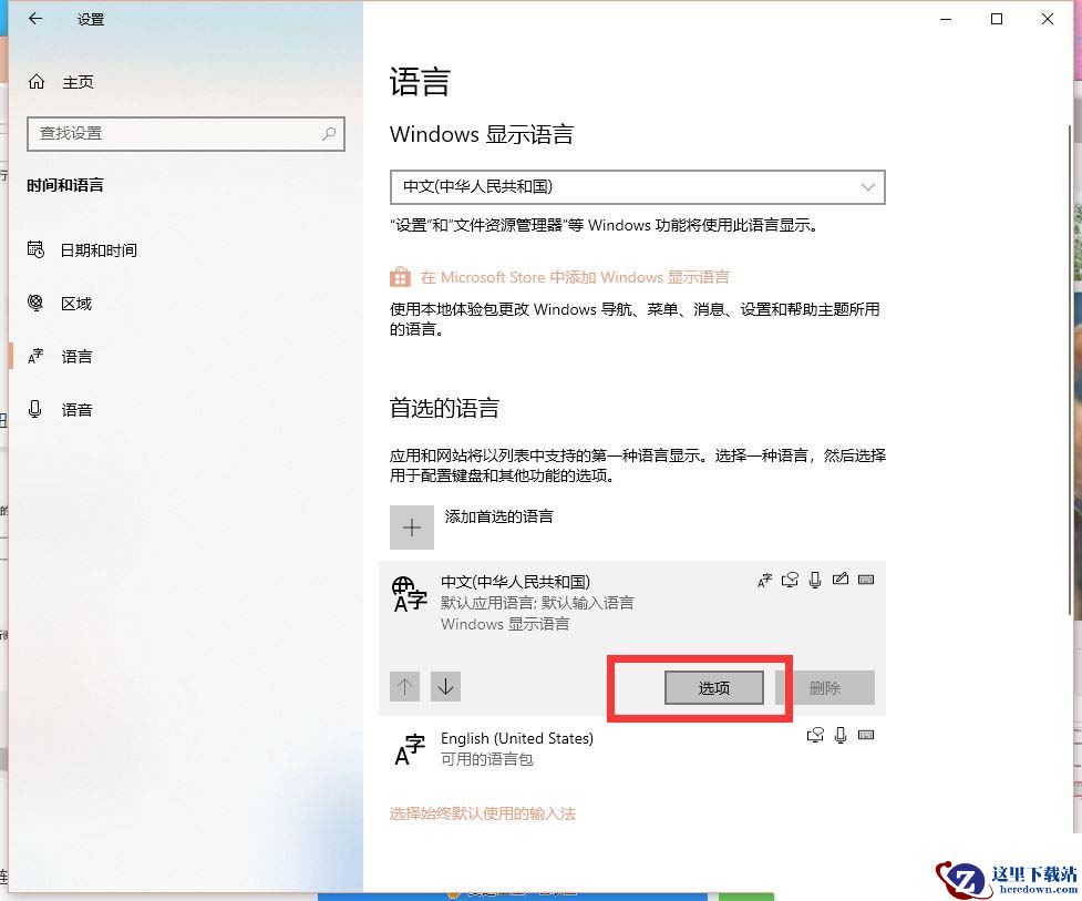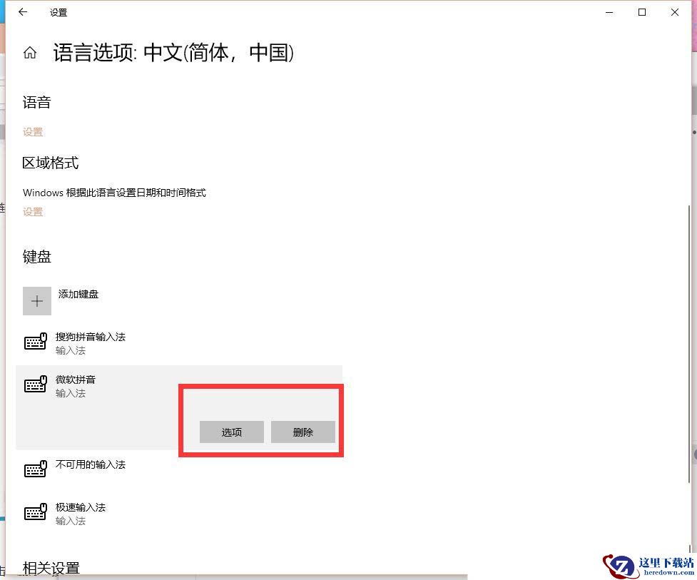 4、语言选项:中文(简体,中国),点击键盘下的微软拼音输入法,再点击删除即可;