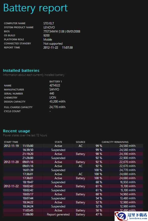该报告提供有关电池的详细信息,包括名称、制造商、序列号、化学成分和循环次数。您还可以查看一段时间内的使用情况报告。
