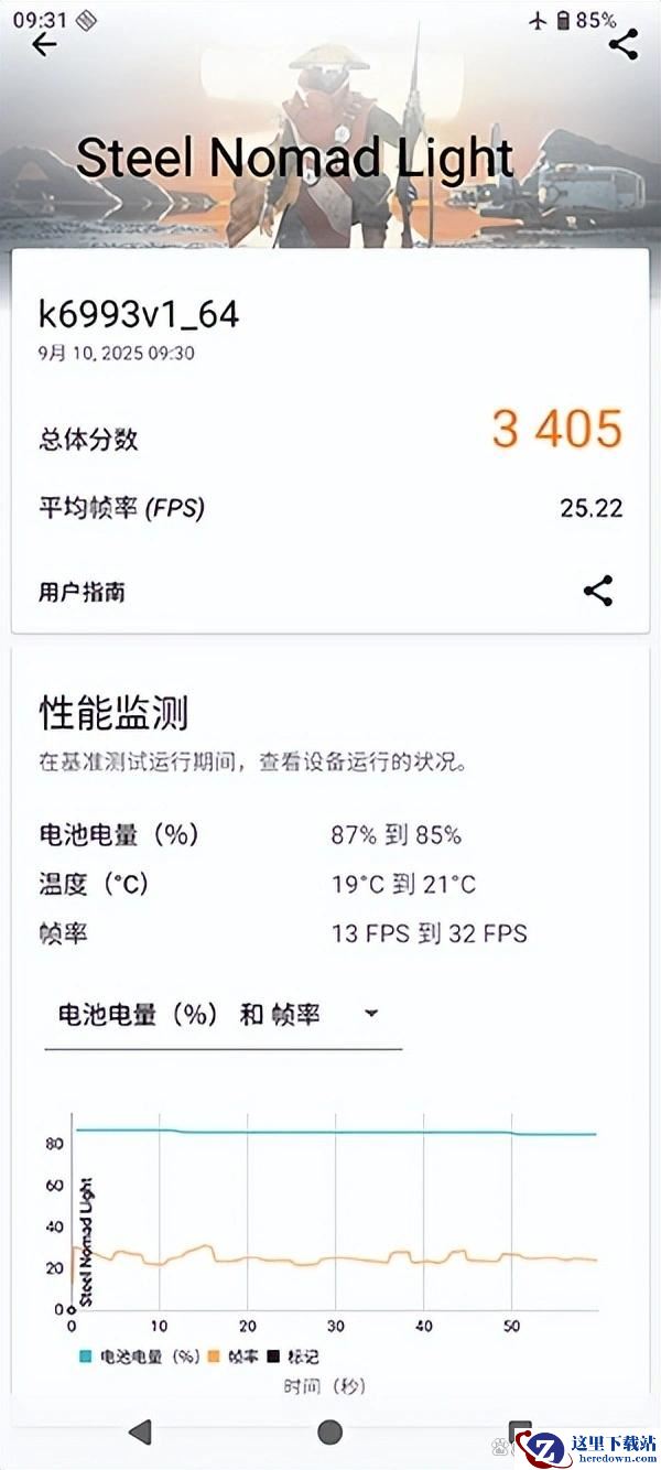 3DMark Steel Nomad Light 1440P这项测试对于当下旗舰机来说也是不小的压力,来看看天玑9500的表现如何——最终得分3405,平均FPS 25.22,再来看看过程,温度表现相当稳定,一直在30度一下,对比上一代的2400分数拥有将近1000分的提升,性能也超过了最新的苹果 A19 Pro 。