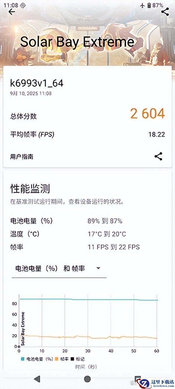 天玑9500在3DMark的Solar Bay Extreme光线追踪测试中,得分2604,帧率11-22FPS,平均帧率18.22,较前代提升超过50%。