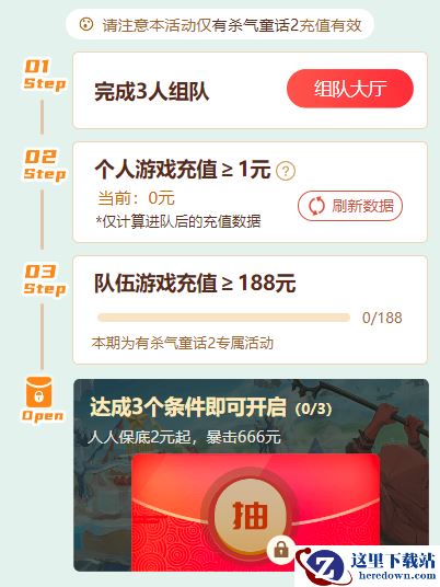 【活动内容】:完成3人组队、个人游戏充值≥1元、队伍游戏充值≥188元三个任务,即可开启红包,保底2元起,更有机率暴击666元!