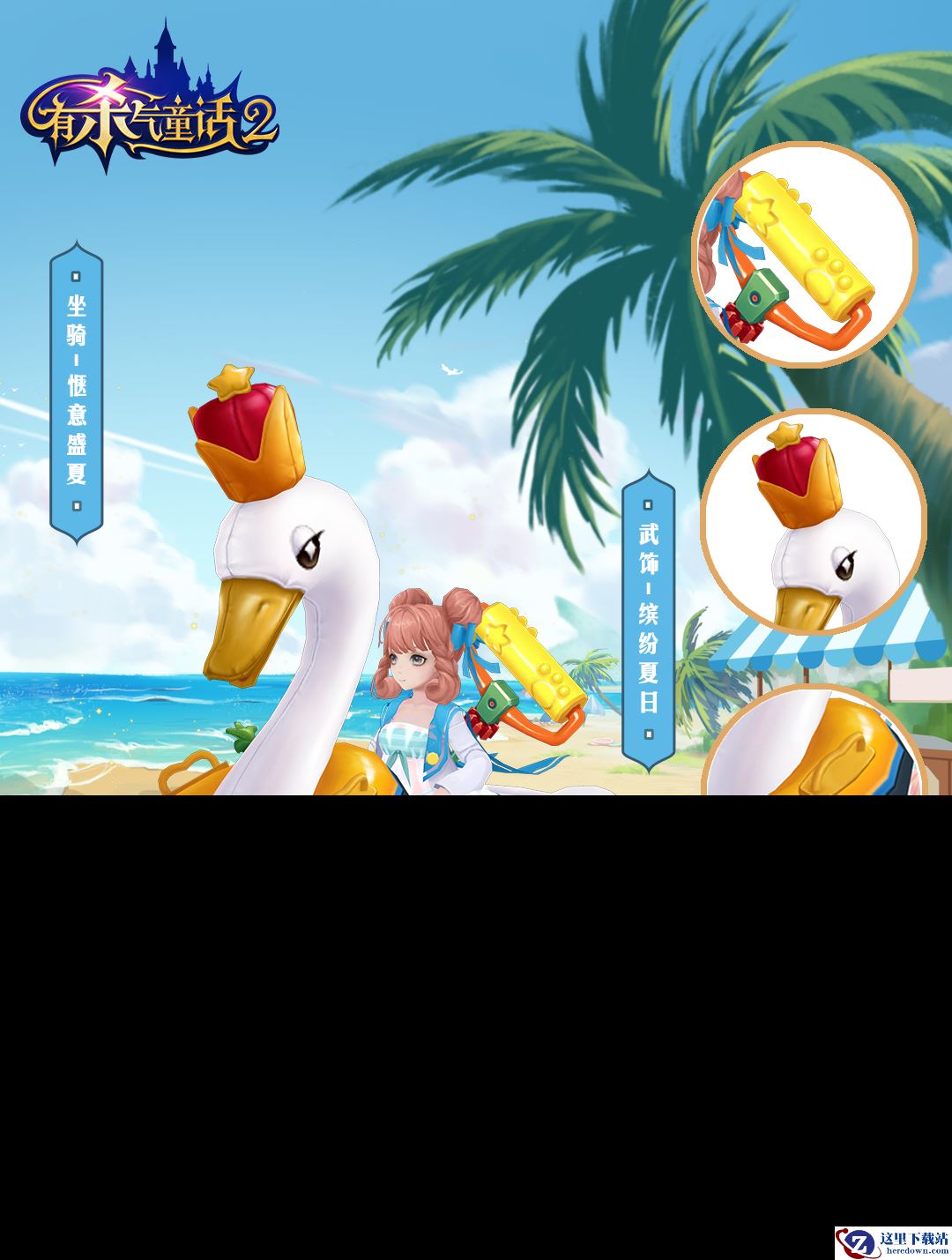 白天鹅泳圈【惬意盛夏】和武饰【缤纷夏日】,是为冒险者倾心打造的童年回忆。白天鹅头戴皇冠,佩戴脖子处的泳圈,Q萌感十足!!