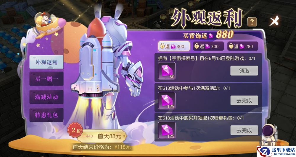 【活动玩法】:购买宇宙探索号背饰,等价钻石将在完成指定人任务后全额返还,相当于可免费获得童话年中限定航天背饰!外观返利“0元购”不容错过~