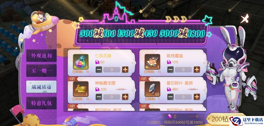 【满减活动】:在活动页面购买星印碎片-星辰、神秘宝藏图和装饰魔盒等道具,达到一定额度后,即可减去设定的优惠额度,买得多优惠力度越大!