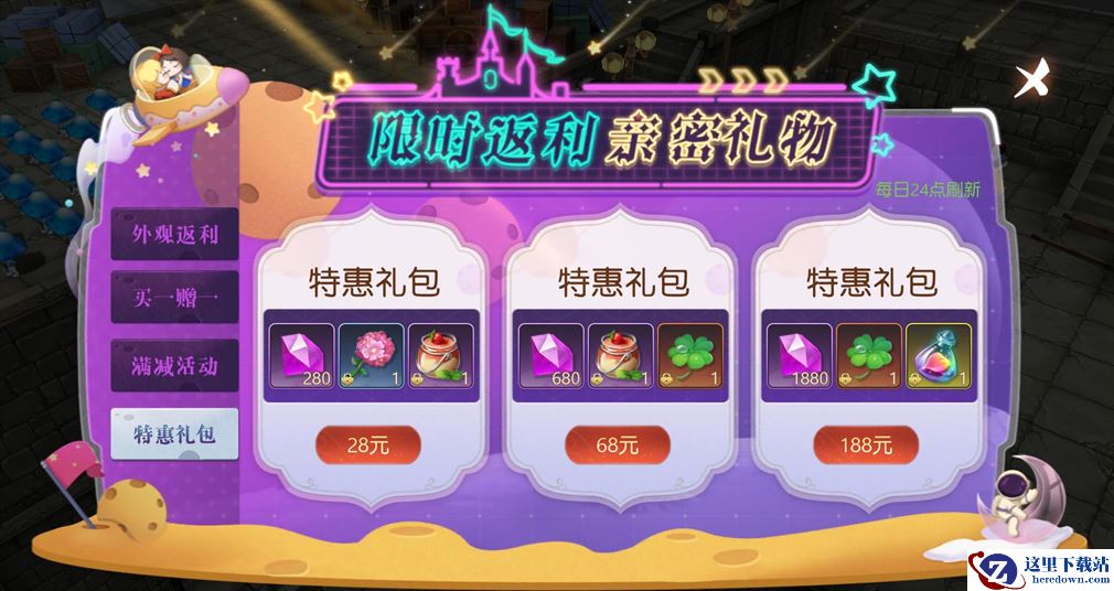 【特惠礼包】:限时返利亲密礼物,多档礼包挑选!七色花瓣、幸运四叶草和海量钻石抱回家~