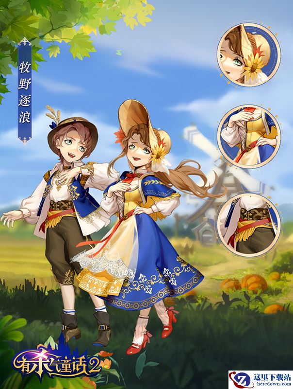 服饰“牧野逐浪”整体呈金黄与深蓝色,巧妙的搭配完美突显西方中世纪的劳作生活!女性的复古时代感长裙搭配随风飘逸的红色丝带,帽檐上的向日葵与枫叶更显别致;男性的田野风夹克,腰间红色丝带缠绕着金黄麦穗,预示着秋收时节五谷丰登,细节拿捏的满满~