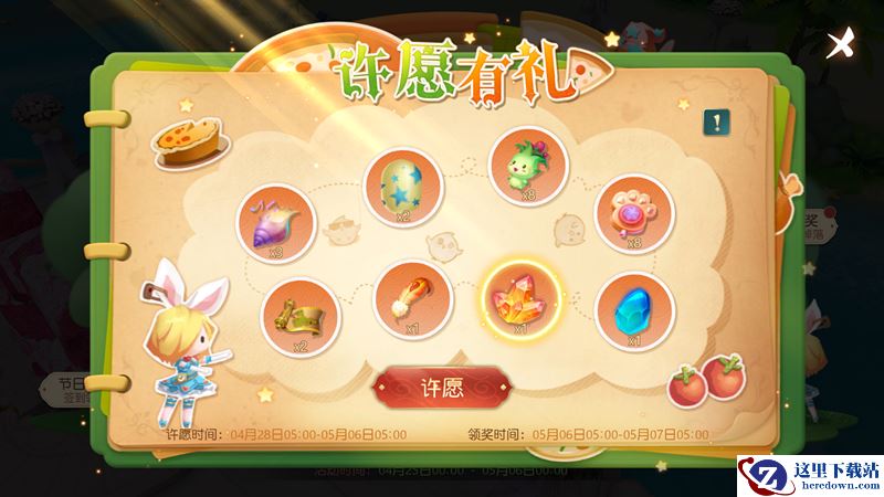【奖励说明】:冒险者可以通过许愿每天选择一种物品,在指定领取时间内领取每天许愿的道具!