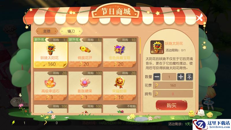【奖励说明】:使用“麦穗”代币可兑换“欣欣向荣”头像框与气泡框等好礼;使用“镰刀”代币可兑换劳动节限定背饰“妖娆太阳花”,头饰“锦簇花环”等道具!