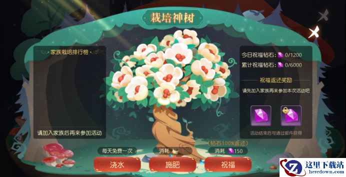 【活动内容】:冒险者通过浇水、施肥和祝福的方式栽培神树,为本家族增加栽培积分。