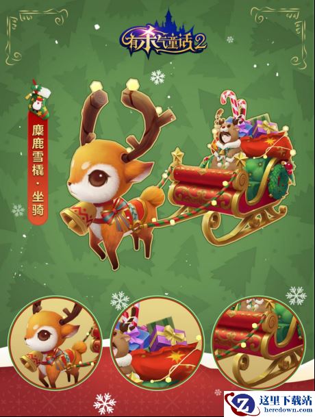圣诞节主题坐骑“麋鹿雪橇”重磅登场,童话故事里的可爱麋鹿竟然就在我们身边。大大的脑袋小小的身体,简直萌力爆表。雪橇红绿搭配的颜色,加上彩灯形状的缆绳,突出一个圣诞味儿。雪橇后满满当当的礼盒,圣诞氛围感直线拉满!