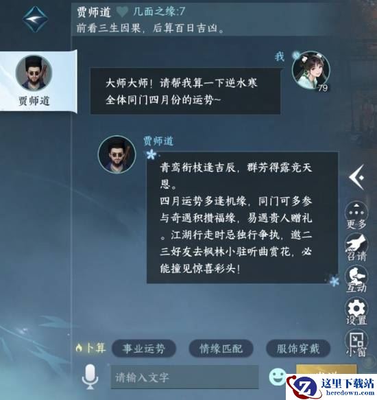 比如,新版本增加了一个“赛博算命”玩法。官方介绍,全新卜卦NPC以满血版Deepseek为引擎,熟读《穷通宝鉴》《三命通会》《渊海子平》等经典书籍,懂得八字、卦象、六爻、六壬、风水、万年历等专业玄学知识;并面向逆水寒手游的东方世界观进行了专题优化,堪称“权威赛博命理学大师”。据说还可以算现实中的正缘、气运、梦境。
