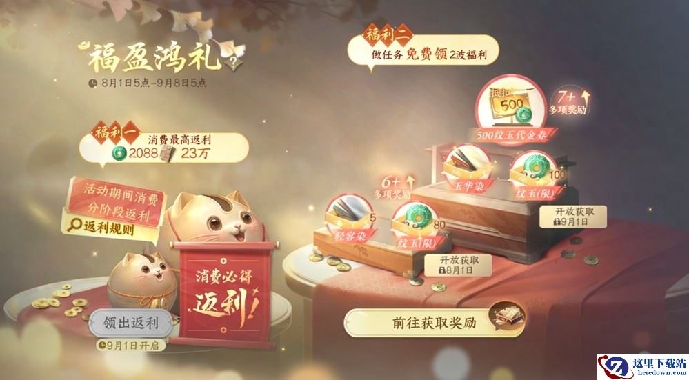 【福盈鸿礼】二期活动开启,完成后可获得500纹玉代金券、100限定纹玉、五十万交子等丰厚奖励。(奖励任务无需消耗纹玉也可以完成)。此外,9月1日将正式开启返利,最高可领取2088纹玉返利。