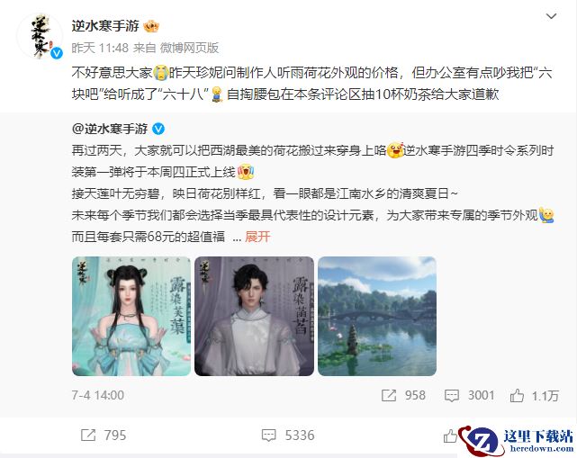 本次更新,游戏上架了全新“小荷花”时装,时装的售价仅仅6元——为了突出时装售价之低,《逆水寒》手游官方还玩梗,表示游戏此前时装定价的时候,把“六块吧”听成“六十八”,闹出了一个小乌龙。